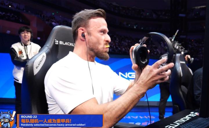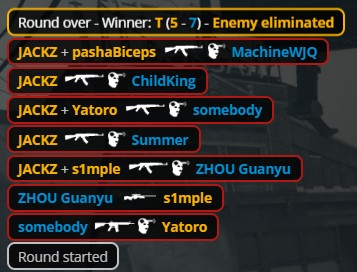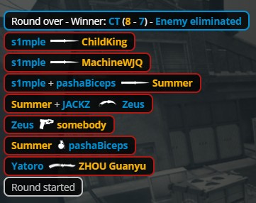 第7回合,周冠宇给s1mple使用一边唱歌一边打游戏技能,所有人仍999血量,手雷伤害超高,cy在没人注意的角落炸飞了玩神。s1mple唱着家乡的小曲拿下四杀。