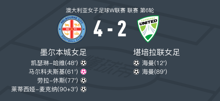 在澳大利亚女子足球W联赛第6轮的较量中,墨尔本城女足坐镇主场迎战堪培拉联女足。比赛中,堪培拉联的海曼率先破门,为球队取得领先。随后,墨尔本城的凯瑟琳-哈维扳平比分。比赛进行到中段,堪培拉联的马尔科夫斯基不慎自摆乌龙,使得墨尔本城反超比分。紧接着,劳拉-休斯再下一城,扩大了墨尔本城的领先优势。尽管海曼再次为堪培拉联建功,但莱蒂西娅-麦克纳的进球为墨尔本城锁定胜局。最终,墨尔本城女足以4-2战胜堪培拉联女足,取得了本场比赛的胜利。