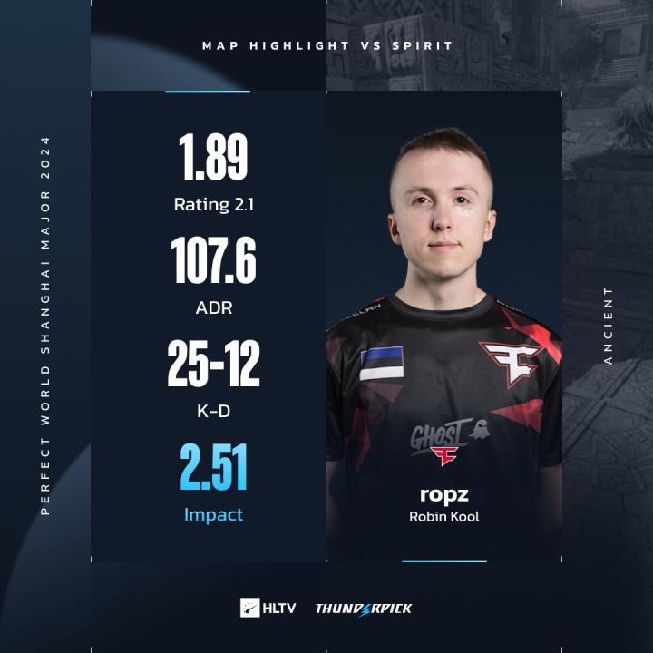 责任神ropz在危难之际又一次站了出来,贡献1.89rating,Impact高达2.51。