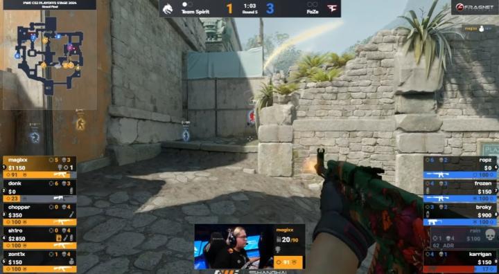 上半场手枪局,Spirit进攻方开zont1x在A厅单摘broky转B,magixx瞬秒雨神后再补枪双杀,但绿龙其余3人均白给,FaZe赢下手枪局。