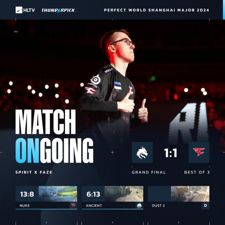 北京时间12月15日,CS2上海Major决赛,图二Ancient中,FaZe以13-6击败Spirit,将大比分扳成1-1。