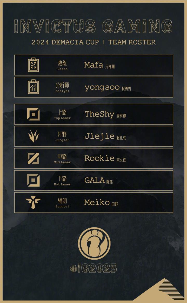 北京时间12月15日晚,IG官方宣布了队伍参加2024年德玛西亚杯的名单,TheShy、Jiejie、Rookie、Gala、Meiko5人均在列。