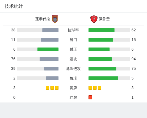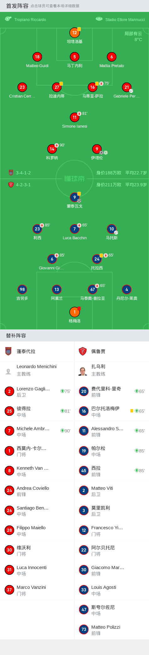 在意大利足球丙级联赛B组第19轮的较量中,蓬泰代拉坐镇主场迎战佩鲁贾。比赛中,蓬泰代拉的伊塔伦表现出色,成功打入两球,展现了强大的进攻能力。佩鲁贾方面,蒙泰瓦戈也不甘示弱,为球队攻入一球。比赛接近尾声时,佩鲁贾的格梅洛因犯规被罚下场。最终,蓬泰代拉以2-1的比分战胜佩鲁贾,取得了本场比赛的胜利。