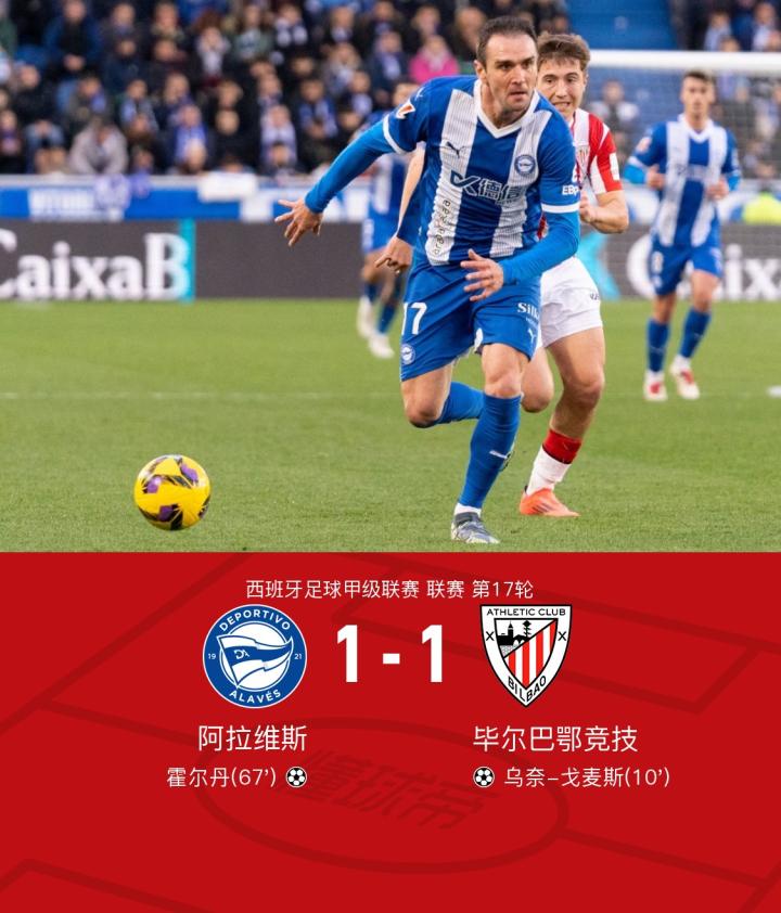 在西班牙足球甲级联赛第17轮的较量中,阿拉维斯坐镇主场迎战毕尔巴鄂竞技。比赛中,毕尔巴鄂竞技的乌奈-戈麦斯率先为球队取得进球,展现了出色的个人能力。随后,阿拉维斯的霍尔丹也不甘示弱,为主队扳平比分。最后时刻维维安绝杀被吹。经过激烈的对抗,双方最终以1-1握手言和,各取一分。