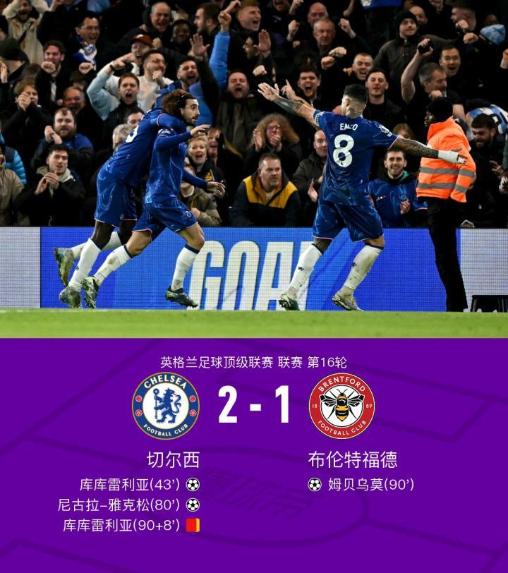 在英格兰足球顶级联赛第16轮的较量中,切尔西坐镇主场迎战布伦特福德。比赛上半场库库雷利亚在马杜埃凯的助攻下抢点头球破门完成赛季首球,下半场桑乔下底传中,雅克松垫射空门打高,内尔高禁区凌空端射,罗伯特-桑切斯贡献神扑,随后法比奥-卡瓦略门前一次抢射击中横梁弹出,恩佐送出助攻,雅克松小角度破门将比分扩大,比赛尾声沙德助攻姆贝乌莫单刀推射扳回一城,最终,切尔西以2-1战胜布伦特福德,取得了本场比赛的胜利,在全场比赛结束后,库库雷利亚因和沙德有冲突,裁判对其出示第二张黄牌,下场比赛将停赛。
