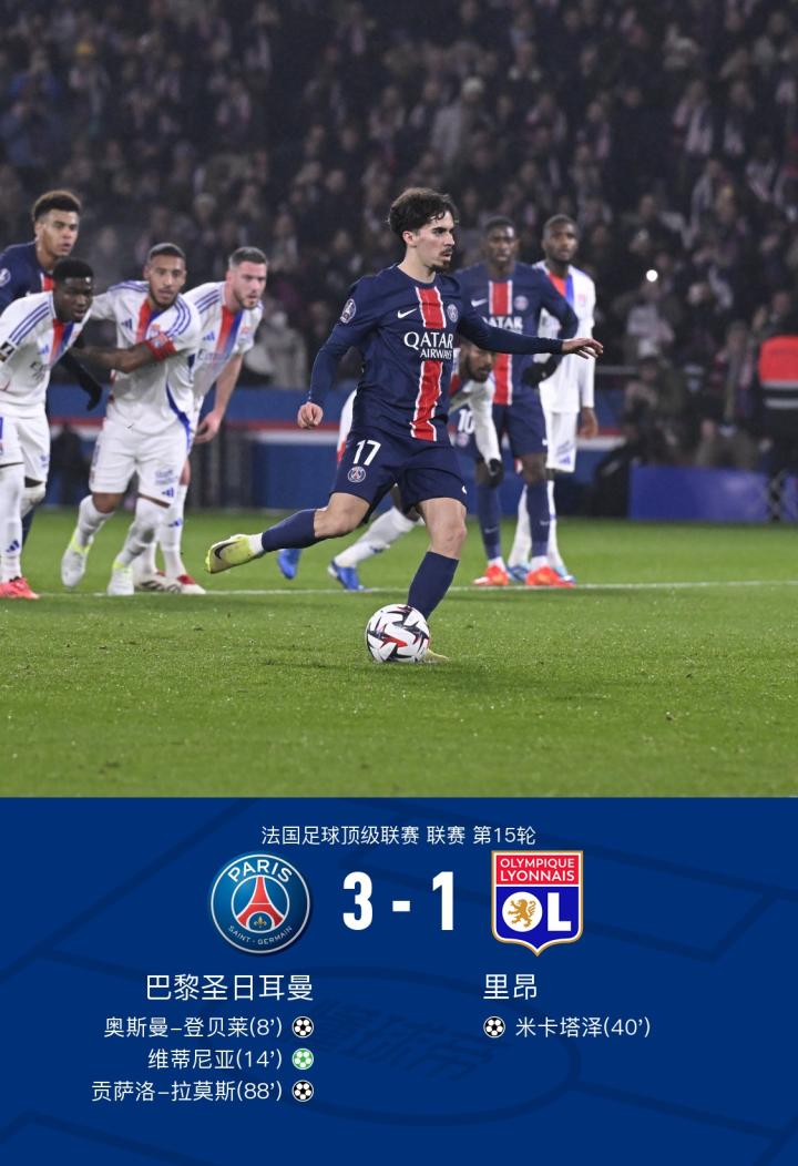 北京时间12月16日3:45,法甲第15轮,巴黎圣日耳曼主场对阵里昂。上半场,杜埃助攻奥斯曼-登贝莱推射破门,随后杜埃造点,维蒂尼亚主罚命中,李刚仁推射被门将没收,米卡塔泽挑射破门扳回一分。下半场,扎伊尔-埃梅里推射被门将扑出,随后阿什拉夫越位在先,杜埃进球被吹,比赛尾声阶段贡萨洛-拉莫斯补射破门锁定胜局,最终,巴黎3-1里昂结束联赛两连平,里昂各项赛事九场不败遭终结。