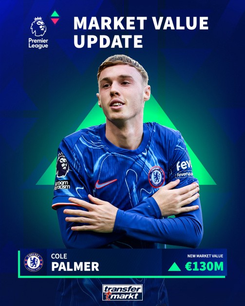 今年10月,帕尔默的身价为9000万欧,随着最近一次更新,帕尔默的身价暴涨4000万欧,达到1.3亿欧,他是切尔西目前阵中身价最高的球员。