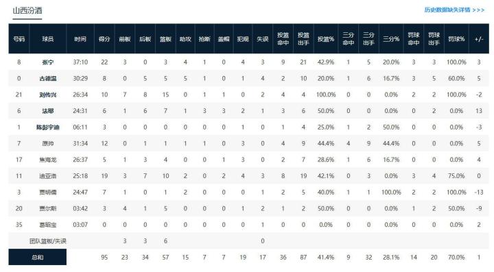 山西汾酒张宁22分3板4助1断,哈米杜-迪亚洛19分10板2助2帽,原帅12分1板1助1断;