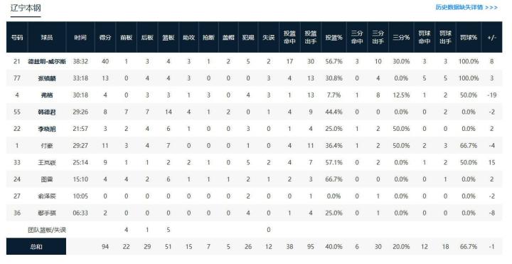 辽宁本钢德兹明-威尔斯40分4板2助,张镇麟13分4板3助。