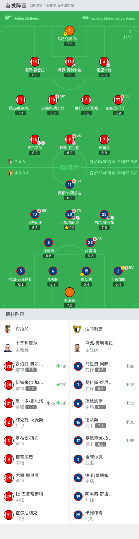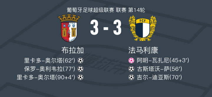 布拉加3-3法马利康,里卡多-奥尔塔两球,吉尔-迪亚斯破门
