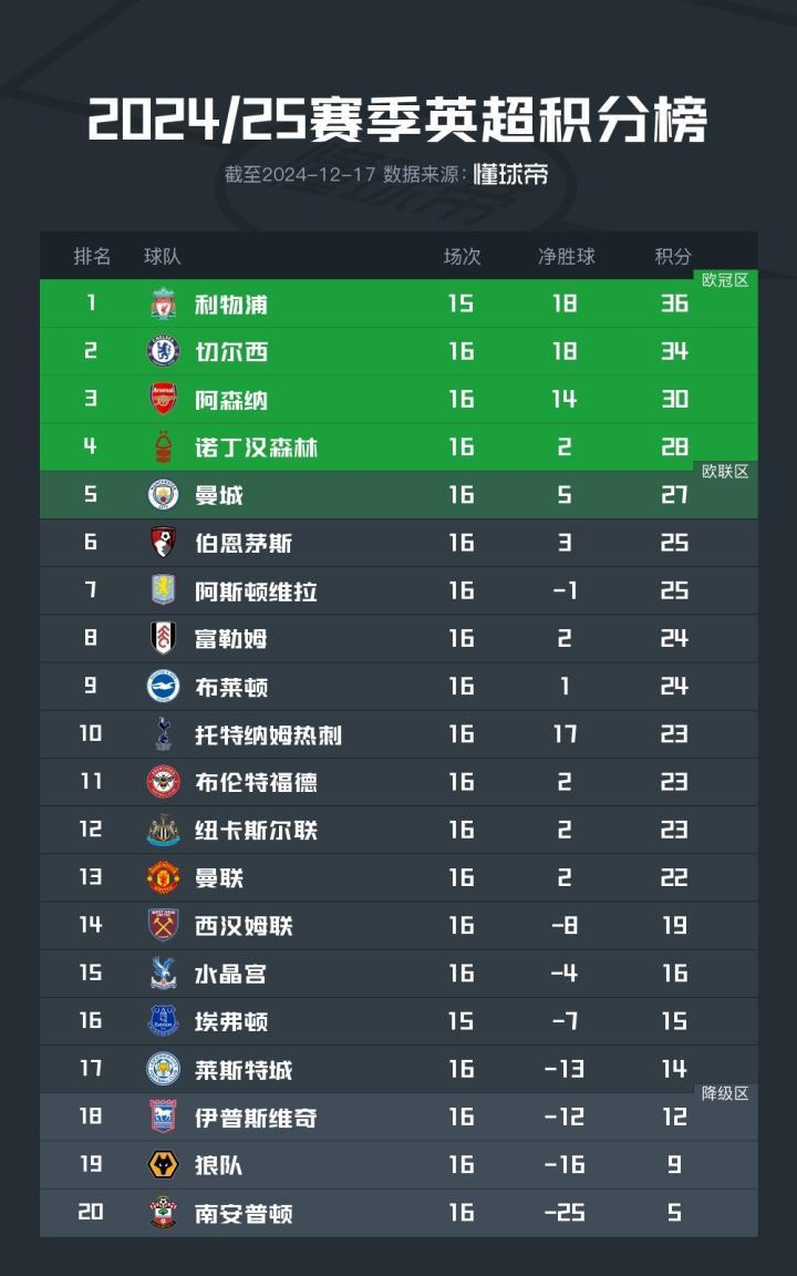 北京时间12月17日,2024/25赛季英超联赛结束了第16轮的全部较量,积分榜的形势也产生了进一步的变化。