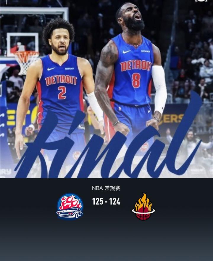 加时赛活塞蒂姆-哈达威拿下9分,热火吉米-巴特勒拿下4分,最终活塞125-124战胜热火