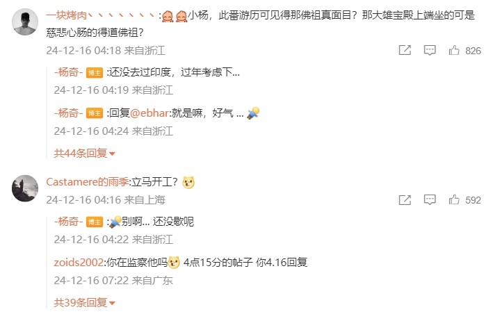 在评论区里,有玩家调侃道:“立马开工?”杨奇则表示:“别啊...还没歇呢。”