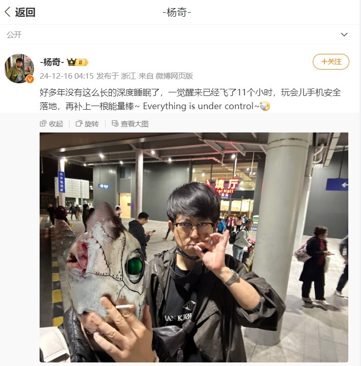 《黑神话》美术总监杨奇已回到中国,表示自己真的“好气”