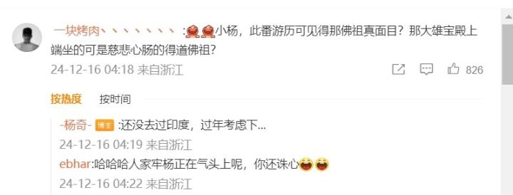 还有玩家调侃:“小杨,此番游历可见得那佛祖真面目?那大雄宝殿上端坐的可是慈悲心肠的得道佛祖?”杨奇再次表示:“还没去过印度,过年考虑下...”一位玩家再度“开涮”杨奇:“哈哈哈人家牢杨正在气头上呢,你还诛心。”杨奇说道:“就是嘛,好气...”