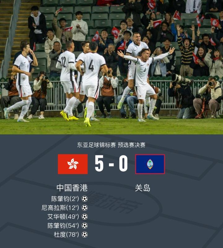 在东亚足球锦标赛预选赛决赛中,中国香港队迎战关岛队。上半场陈肇钧头球闪击破门,尼高拉斯推射扩大比分,安永佳失良机,下半场艾华顿破门继续扩大比分,陈肇钧梅开二度。最终,中国香港队以5-0的比分大胜关岛队,取得了一场酣畅淋漓的胜利。