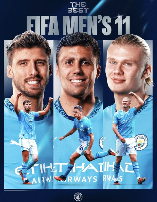 今天凌晨,曼城官方晒出海报祝贺这3位球员。曼城官方表示:“3位曼城球星入围了今年的FIFA年度最佳阵容,鲁本-迪亚斯、罗德里和哈兰德。”