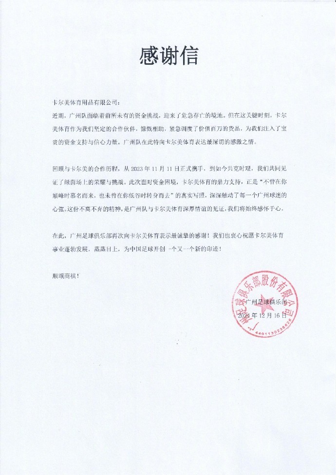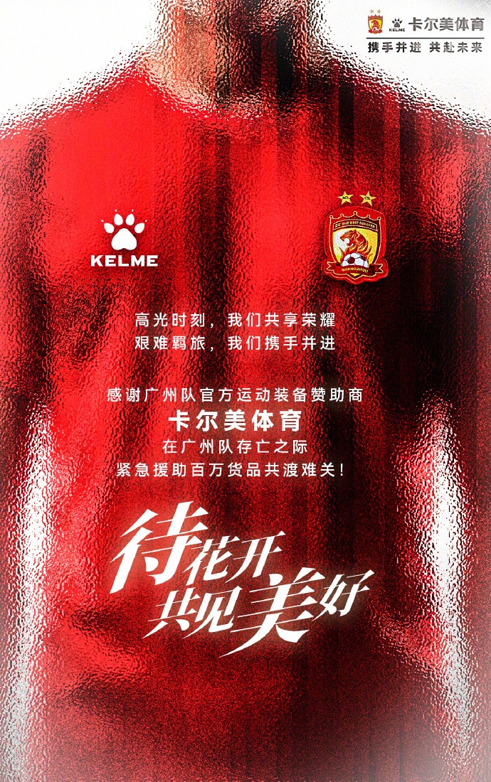 对此,广州足球俱乐部官方发文表达了感谢:“高光时刻,我们共享荣耀;艰难羁旅,我们携手并进!感谢广州队官方运动装备赞助商卡尔美体育,在广州队存亡之际,紧急援助百万货品共渡难关! ”