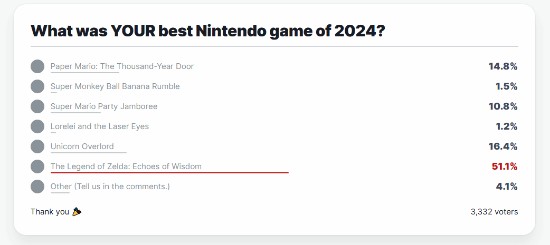 除此之外,在玩家的年度最佳任天堂游戏投票榜里,《塞尔达传说:智慧的再现》同样几乎断崖式领先于其他游戏。