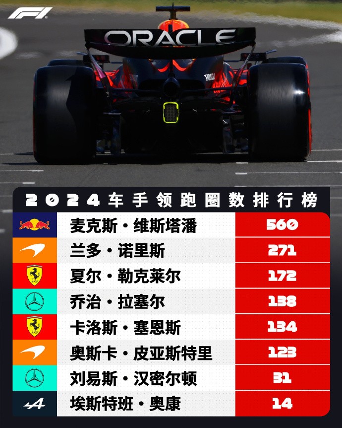 2024赛季F1车手领跑圈数排行:维斯塔潘560圈断层领先