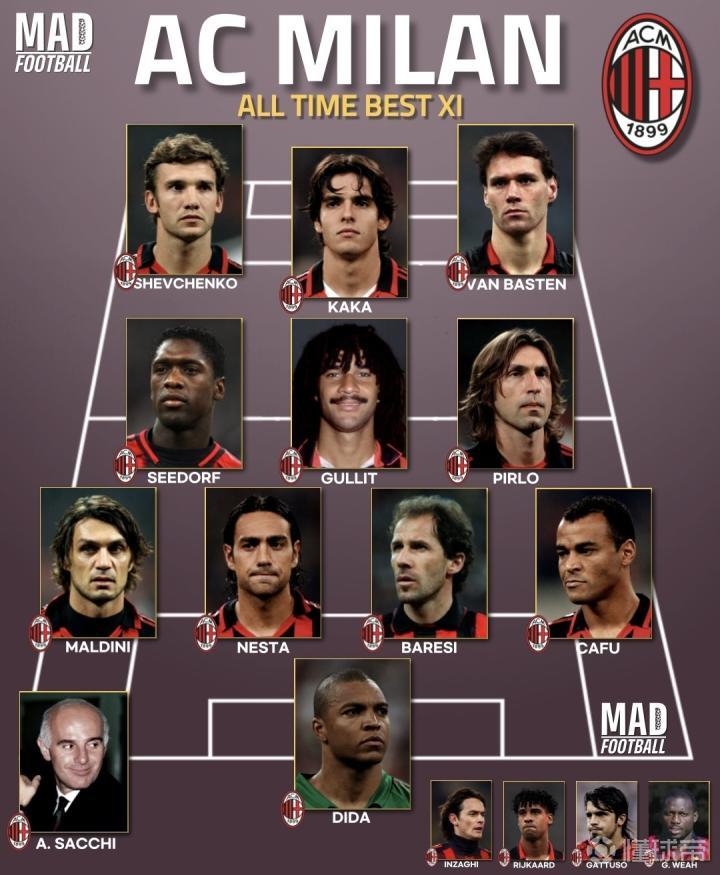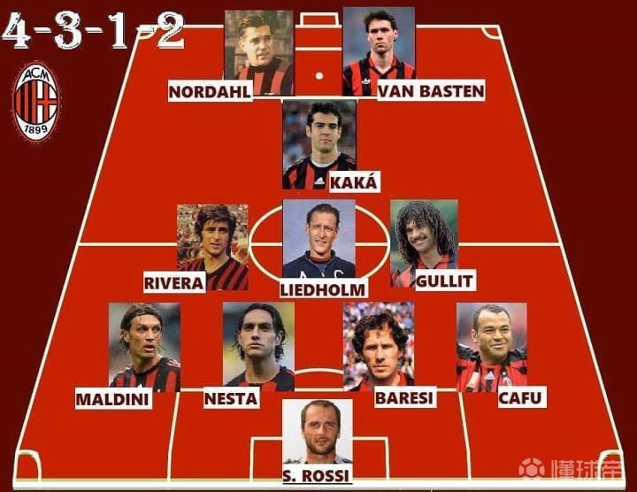 AC米兰历史最佳阵容,你怎么选? 每个人都有各自的心头好,或从实战价值或者喜爱度等等因素,各有各的最佳11人,包括巴雷西、马尔蒂尼、内斯塔、卡卡、范巴斯滕和古利特,应该是不管怎么排列都存在的选择。 门将:迪达、塞巴斯蒂安·罗西、吉奥瓦尼·加利 后卫:不管选择3后卫还是4后卫,巴雷西、马尔蒂尼和内斯塔这三位都是毫无疑问地入选,如果4后卫大多都是加上卡福吧 中场:里维拉、里杰卡尔德、古利特、皮尔洛、西多夫、卡卡等,不管什么阵型排列,卡卡和古利特都有一席之地。 前锋:范巴斯滕是第一选择,然后是舍瓦吧。