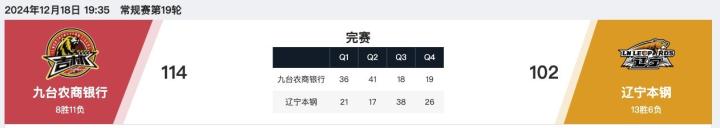 第四节吉林多米尼克-琼斯拿下8分,辽宁凯尔-弗格拿下8分,最终吉林114-102战胜辽宁