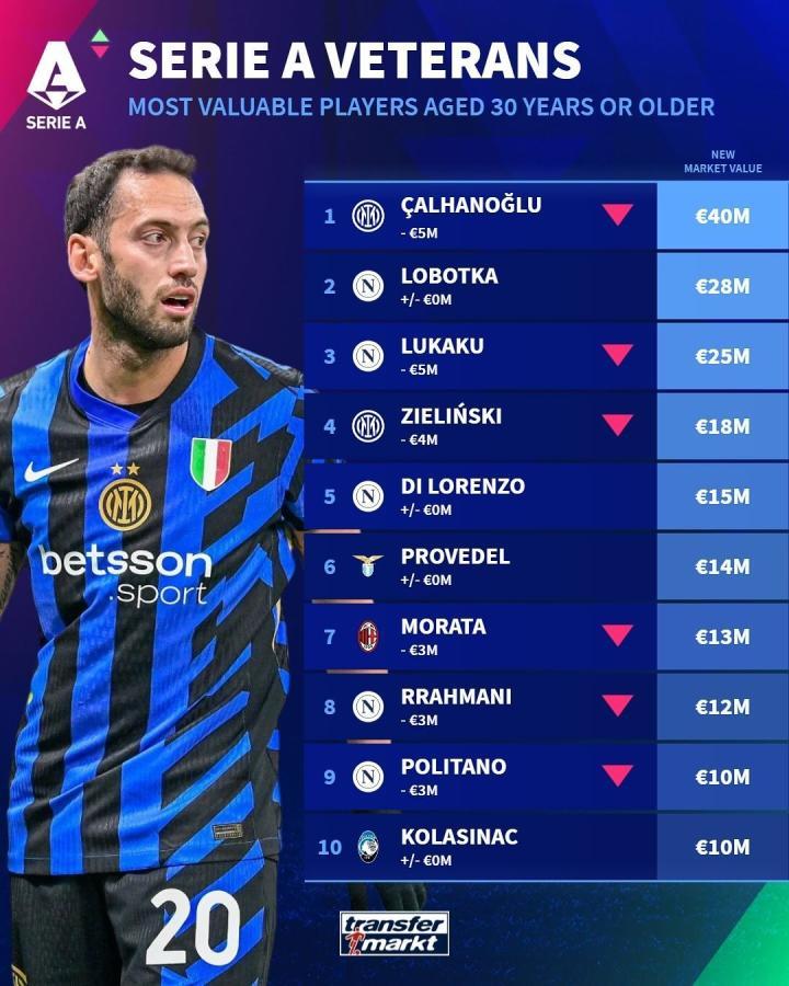 在更新了意甲球员身价后,德国转会市场网站列出了意甲30岁及以上球员身价榜,恰尔汗奥卢4000万欧居首,那不勒斯5人上榜。