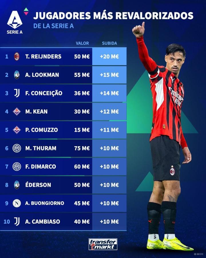 在更新了意甲球员的身价之后,德转还列出了此次更新过后意甲球员身价的涨幅榜,AC米兰中场赖因德斯身价上涨2000万欧元排名第一,亚特兰大前锋卢克曼身价上涨1500万欧元排名第二,尤文图斯边锋弗朗西斯科-孔塞桑身价上涨1400万欧元排名第三。