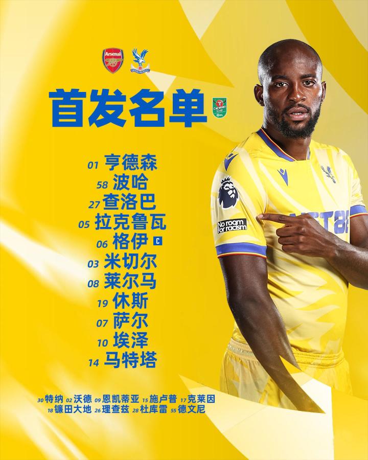 阿森纳 vs 水晶宫丨首发公布 莱尔马连场首发,恩凯蒂亚替补待命