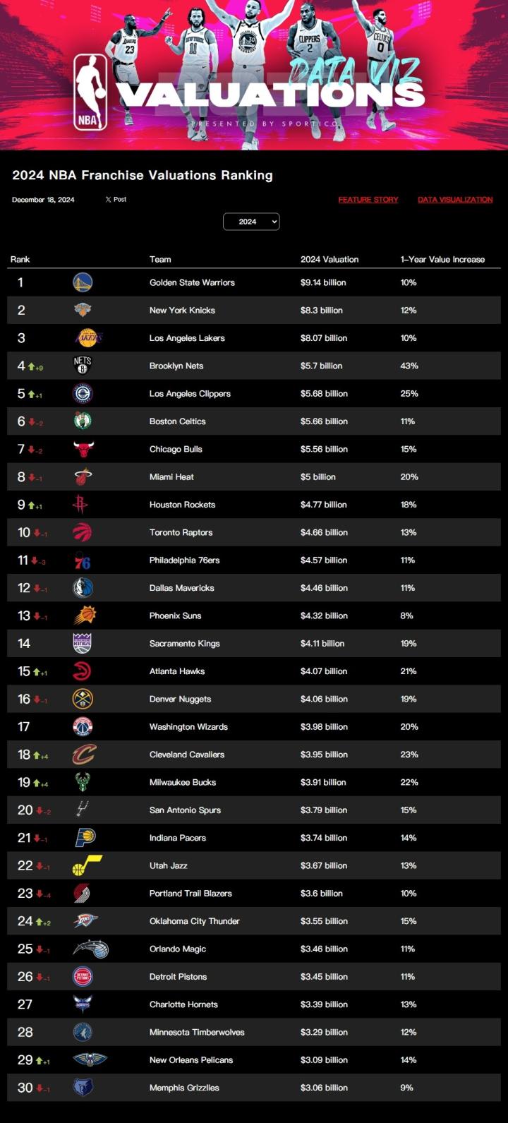 北京时间今日,美国体育商业媒体Sportico发布了2024年NBA30支球队的市值报告。其中勇士队的市值为91.4亿美元,高居榜首。尼克斯(83亿美元)、湖人(80.7亿美元)、篮网(57亿美元)、快船(56.87亿美元)排在二到五位,灰熊(30.6亿美元)排在最后一位。