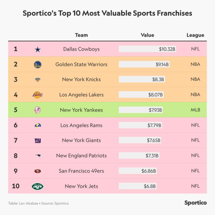 美媒公布NBA球队市值排行榜:勇士91.4亿美元领跑,篮网提升9名至第四
