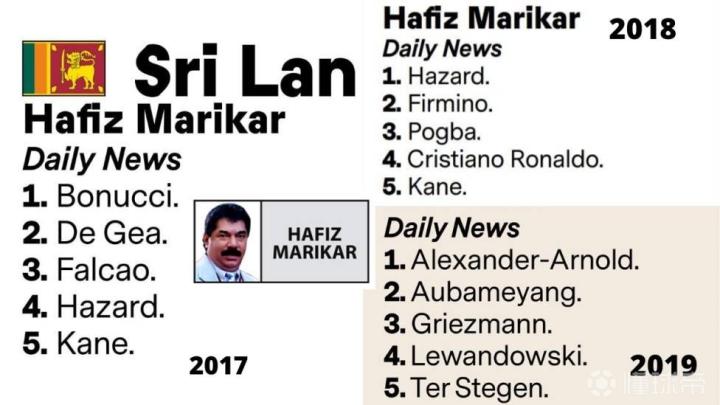 比如这位,金球奖评选史上著名的意识流记者,斯里兰卡《每日新闻》的记者哈菲兹-马里卡尔,这位仁兄在2017年将金球奖第一选票投给了博努奇,2018年投给了阿扎尔,2019年投给了阿诺德,他的第二名分别是德赫亚、菲尔米诺、奥巴梅杨,并不是说他没有权利这么投,而是他的选择完全让人摸不着头脑,感觉不到他的专业性。于是2022年,《法国足球》将投票记者的范围限定在国际足联世界排名前100的国家和地区,以尽可能避免一些看上去没那么专业的选票。
