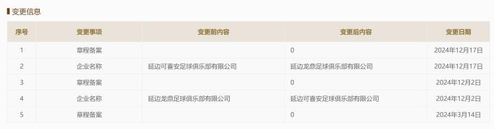 据公开信息显示,12月17日,“延边可喜安足球俱乐部有限公司”又把名称改回了“延边龙鼎足球俱乐部有限公司”。