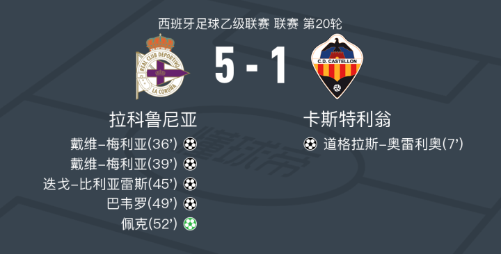 北京时间12月20日西班牙足球乙级联赛 联赛 第20轮,拉科鲁尼亚主场对阵卡斯特利翁。拉科鲁尼亚戴维-梅利亚梅开二度,迭戈-比利亚雷斯破门,巴韦罗破门,佩克破门。卡斯特利翁道格拉斯-奥雷利奥破门。最终比分拉科鲁尼亚 5-1 卡斯迪隆。