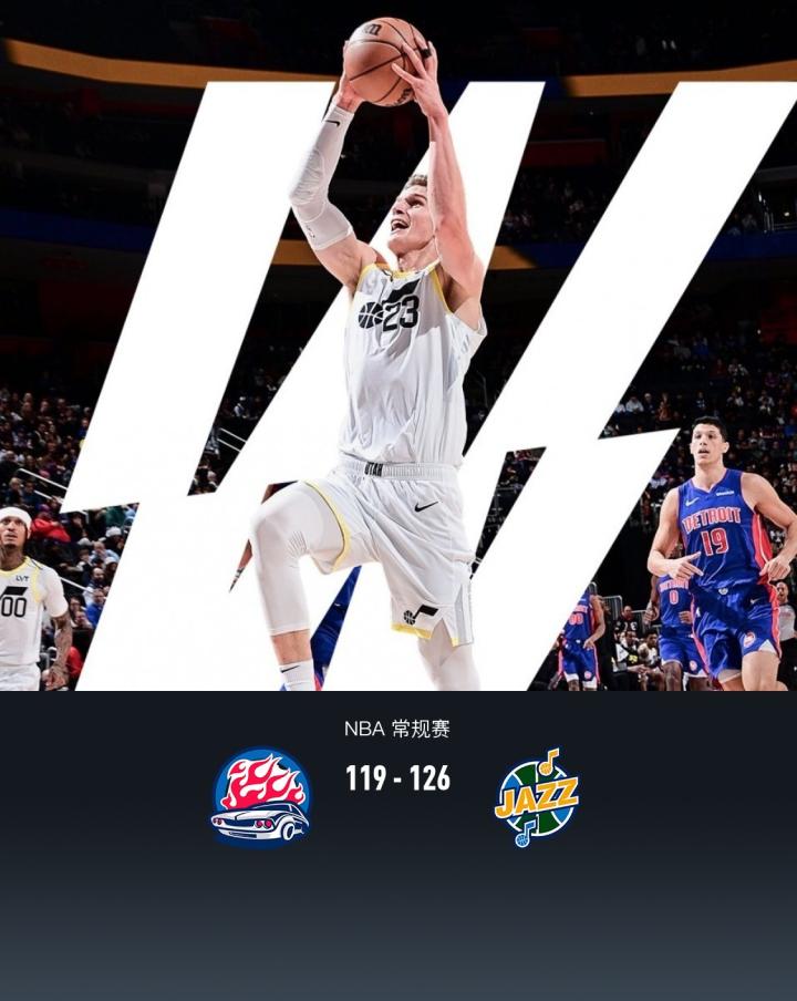 北京时间12月20日,NBA常规赛,爵士126-119力克活塞。活塞坎宁安33分4板7助,比斯利26分2板4助;爵士塞克斯顿30分6板7助,基扬特-乔治28分4板3助。