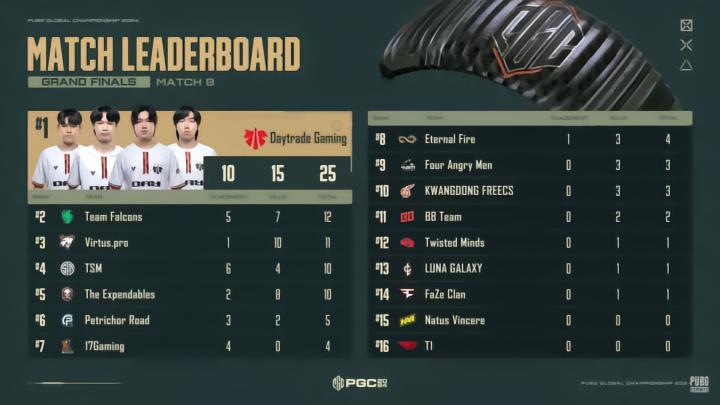 MATCH8,PeRo阶段3遭KDF埋伏掉3人,4am阶段4与KDF交火被劝架团灭,收获3分,17与EF交火被打掉2人。阶段8刷圈,PeRo仅剩Ming一人苟到第5名拿5分,17残编进入前4。决赛圈中,DAY满编队接管比赛,平推17、Falcons、TSM吃鸡。