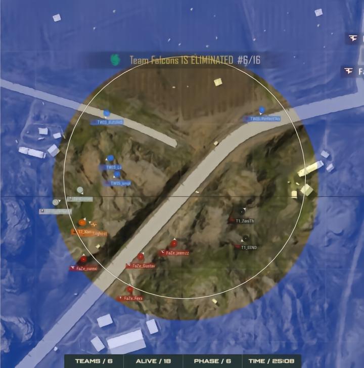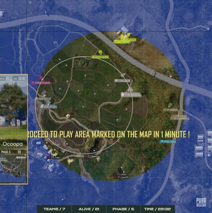 T1在多队混战中脱颖而出,KDF无伤拿到圈北边弱侧位置,以逸待劳的他们在手握道具数量优势的情况下被T1枪法支配,Rain1ng、Type、ZeniTh个人能力爆发打赢了3v4团战,赢下韩国赛区内战。