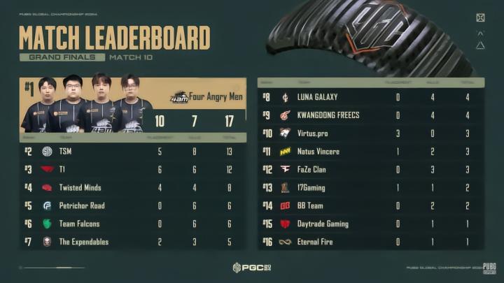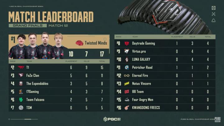 MATCH12,PeRo与4am前期运营连续掉人早早出局。阶段5,17在西部圈边选择避其锋芒,在侧翼放冷枪进入前4,阶段6,17遭到TWIS、FaZe、T1枪线交叉被团灭,拿到7分。
