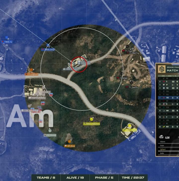 阶段6刷圈给到4am的房区,未给TWIS、TSM、T1任何机会,最后Hsmm发难淘汰T1,帮助队伍7杀吃鸡得到17分。