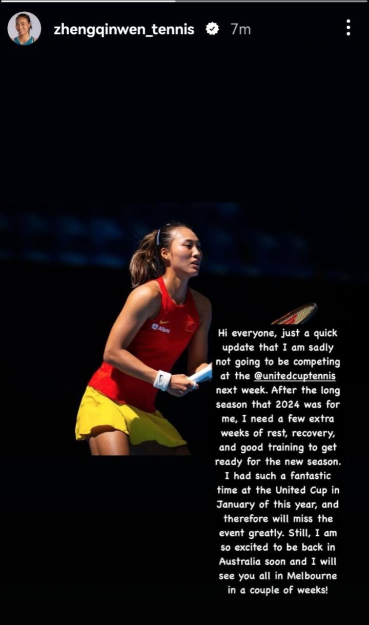 北京时间12月21日,郑钦文在个人社交媒体上宣布退出联合杯:“很遗憾我将不会参加下周联合杯的比赛。在经历了漫长的2024赛季之后,我需要多几周的时间来休息和恢复,好好训练为新赛季做准备。”