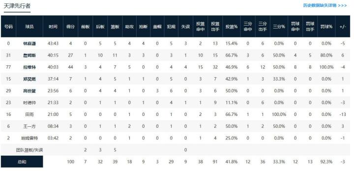 天津先行者马库斯-拉维特44分7板5助,大卫-詹姆斯27分11板3助3断1帽,郑昊燃7分4板1助1断;
