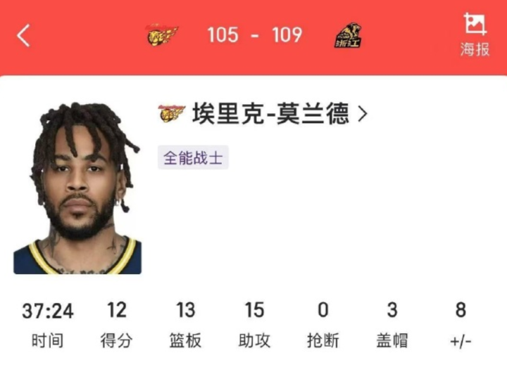 全场比赛,莫兰德贡献12分13篮板15助攻3封盖,表现强势。要知道,辽宁男篮一直拖着莫兰德,只给了50万美元年薪的报价,还一直没有诚心邀请他回归,于是莫兰德生气了,一怒之下接受了广东男篮的合同,这才有了现在的表现。