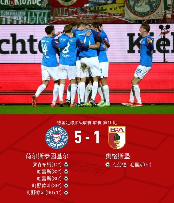 在德国足球顶级联赛第15轮的较量中,荷尔斯泰因基尔坐镇主场迎战奥格斯堡。比赛伊始,奥格斯堡的克劳德-毛里斯率先破门,为客队取得领先。然而,荷尔斯泰因基尔迅速做出回应,町野修斗助攻罗森布姆扳平比分。随后,哈雷斯表现出色,接连打入两球,帮助主队扩大优势。紧接着,町野修斗也加入进攻行列,再次攻破对方球门。比赛接近尾声时,町野修斗在克努森的助攻下再度得分,为荷尔斯泰因基尔锁定胜局。最终,荷尔斯泰因基尔以5-1的大比分战胜奥格斯堡,取得了一场酣畅淋漓的胜利。