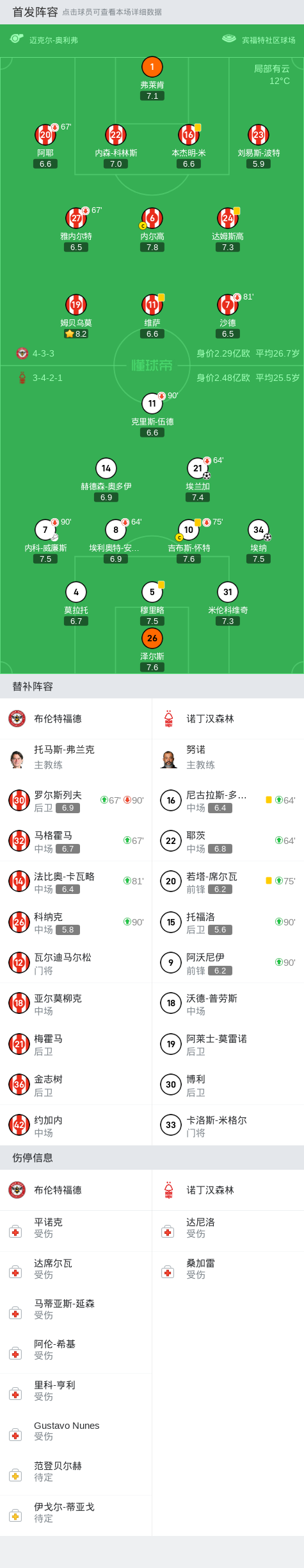 在英格兰足球顶级联赛第17轮的较量中,布伦特福德坐镇主场迎战诺丁汉森林。上半场内科-威廉斯倒三角,埃纳破门。下半场刘易斯-波特解围失误,埃兰加内切破门。全场结束,诺丁汉森林2-0送布伦特福德赛季主场首败。