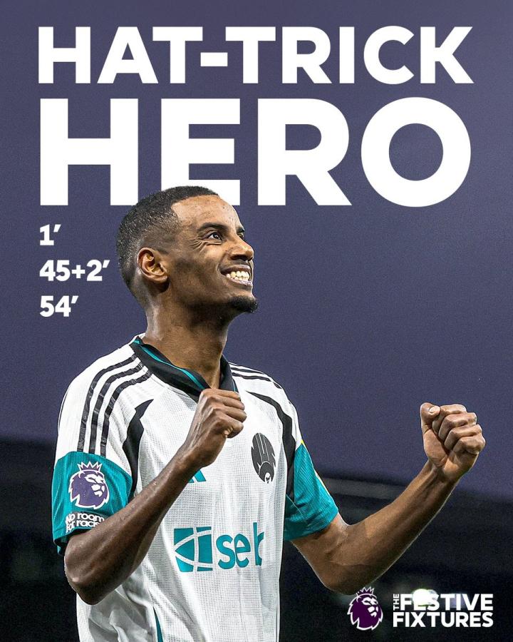 这是伊萨克英超生涯首次上演帽子戏法,他也成为自2019年4月20日的阿约塞-佩雷斯(vs南安普顿)以来,首位在英超单场打入至少3球的纽卡斯尔联球员。