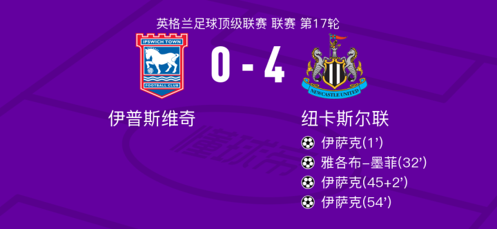 伊普斯维奇vs纽卡斯尔联球员评分:伊萨克9.6分,哈里-克拉克5.7分
