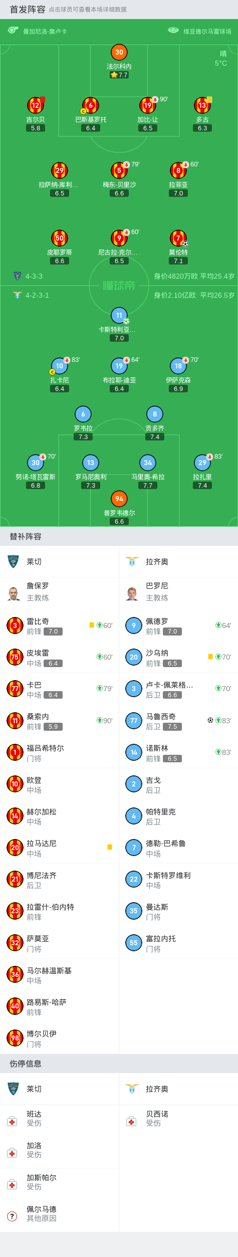 第50分钟,莫伦特外围抽射破门将比分扳平,莱切1-1拉齐奥