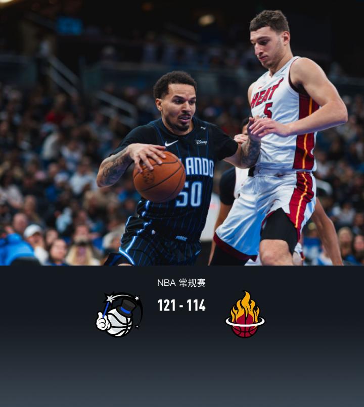第四节魔术科尔-安东尼拿下13分,热火阿德巴约拿下3分,最终魔术121-114战胜热火