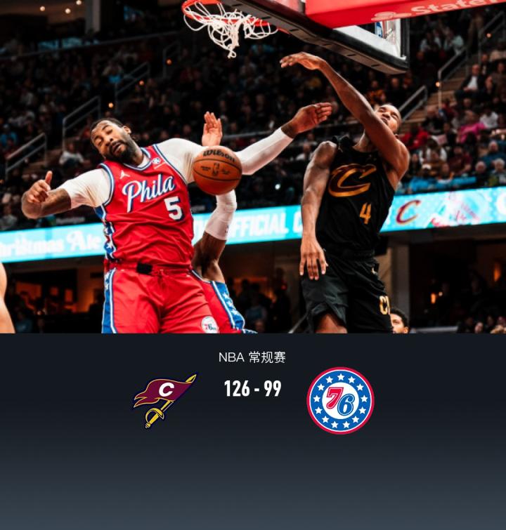 北京时间12月22日NBA常规赛,骑士主场对阵76人,恩比德轮休。半场骑士66-55领先76人,并在下半场最多领先35分,最终骑士以126-99狂胜76人,取得4连胜。