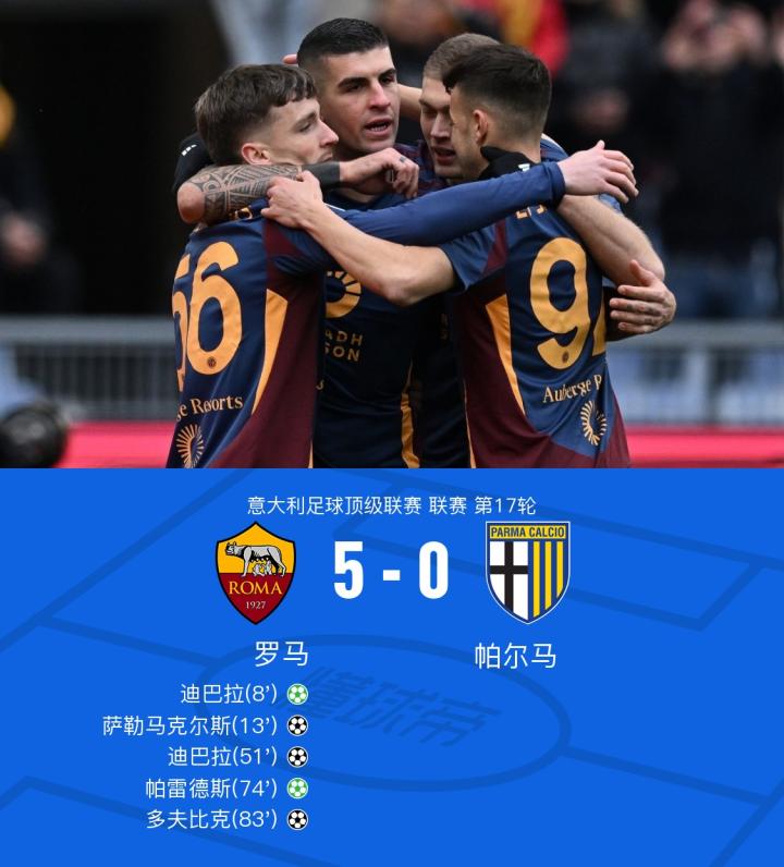 在意大利足球顶级联赛第17轮的比赛中,罗马队在主场迎战帕尔马队。上半场迪巴拉造点,随后亲自主罚命中,之后安赫利尼奥将球传向后点,萨勒马克尔斯抽射破门。下半场迪巴拉补射破门完成双响,之后萨勒马克尔斯造点,帕雷德斯主罚命中,随后迪巴拉传球,多夫比克打空门得手。最终,罗马队以5-0的比分大胜帕尔马队,取得了一场令人瞩目的胜利。